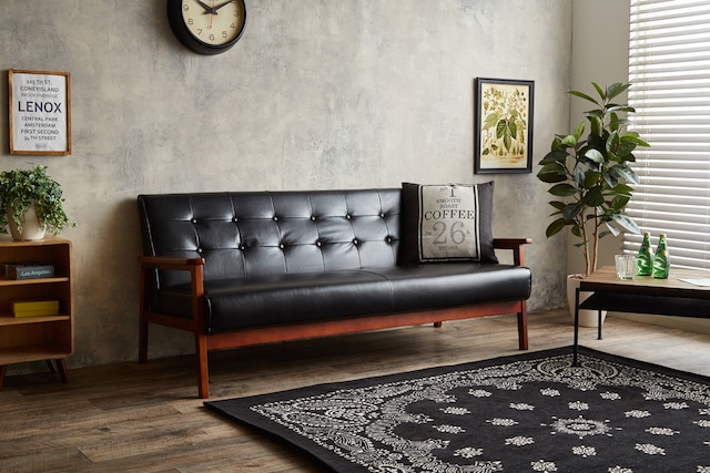 クラシックな趣とモダンな洗練を兼ね備えた、ヴィンテージスタイルの3人掛けソファ。 ブラックのレザー調張地に施されたボタン留めの背もたれが上品な立体感を生み、置くだけで空間に重厚感と落ち着きをもたらします。 木製フレームとアームの深みあるブラウンカラーは、温もりを感じさせるアクセントとなり、インダストリアルやミッドセンチュリー、北欧テイストのインテリアとも相性抜群です。 座面は程よい硬さで身体をしっかり支え、長時間座っても疲れにくい快適な座り心地を実現。 奥行きのある設計により、ゆったりとくつろげるリラックスタイムを叶えます。 脚付きデザインで床との間に空間があるため、お掃除がしやすく衛生的。リビングの主役としてはもちろん、オフィスの待合スペースやカフェ風の空間演出にも最適な一台です。 使い込むほどに味わいが深まるような存在感で、日常のひとときを上質な時間へと導きます。サイズ・容量 【全体】幅:165cm×奥行:72cm×高さ:70cm 【座面高】36cm 【座面幅】152cm 【座面奥行】50cm 【背もたれ高さ】40cm 規格 【ファブリック】天然木・ウレタンフォーム・Sバネ・ポリエステル100% 【PVC】天然木・ウレタンフォーム・Sバネ・PVC 注意事項 ▼誠に恐れ入りますが北海道・沖縄・離島エリアへの配送は行っておりません。 ご注文を頂きましても、お受けできかねますので予めご了承のほどお願い申し上げます。