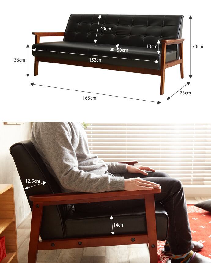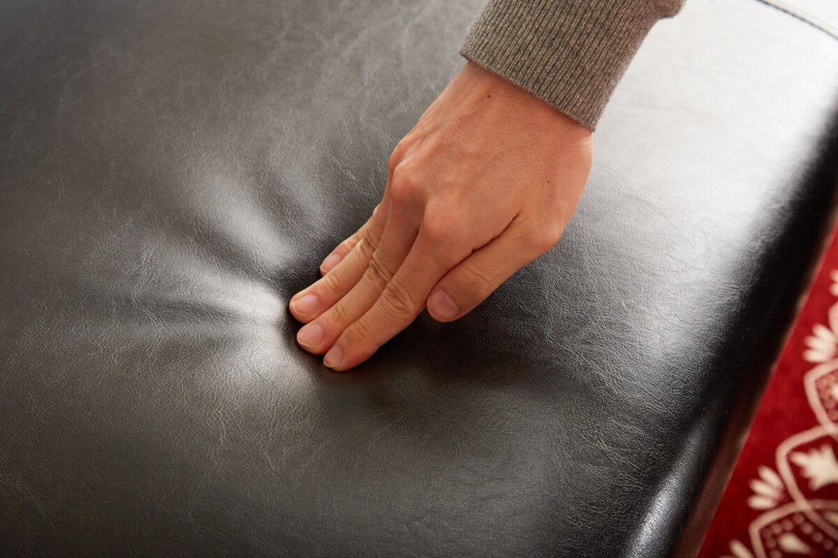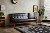ブラックのレザー調張地に施されたボタン留めの背もたれが上品な立体感を生み、置くだけで空間に重厚感と落ち着きをもたらします。